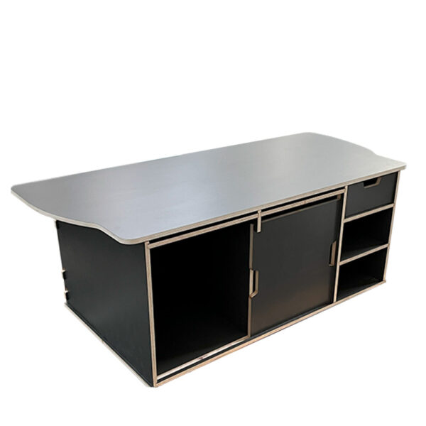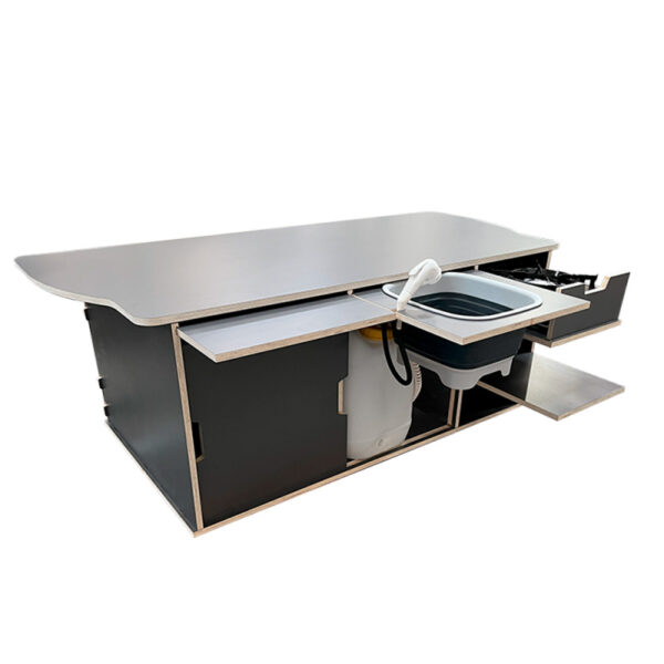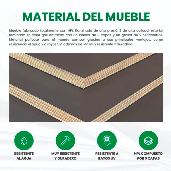 Fabricado en contrachapado HPL de gama alta en color gris, un material ligero, resistente a la humedad y duradero. Diseñado para soportar el uso intensivo y las condiciones cambiantes de un viaje en carretera.