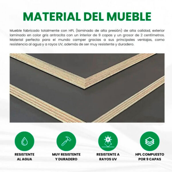 Fabricado con contrachapado laminado en HPL de alta gama, un material resistente, ligero y duradero, preparado para acompañarte en todas tus aventuras, sin preocuparte por la humedad ni el desgaste.